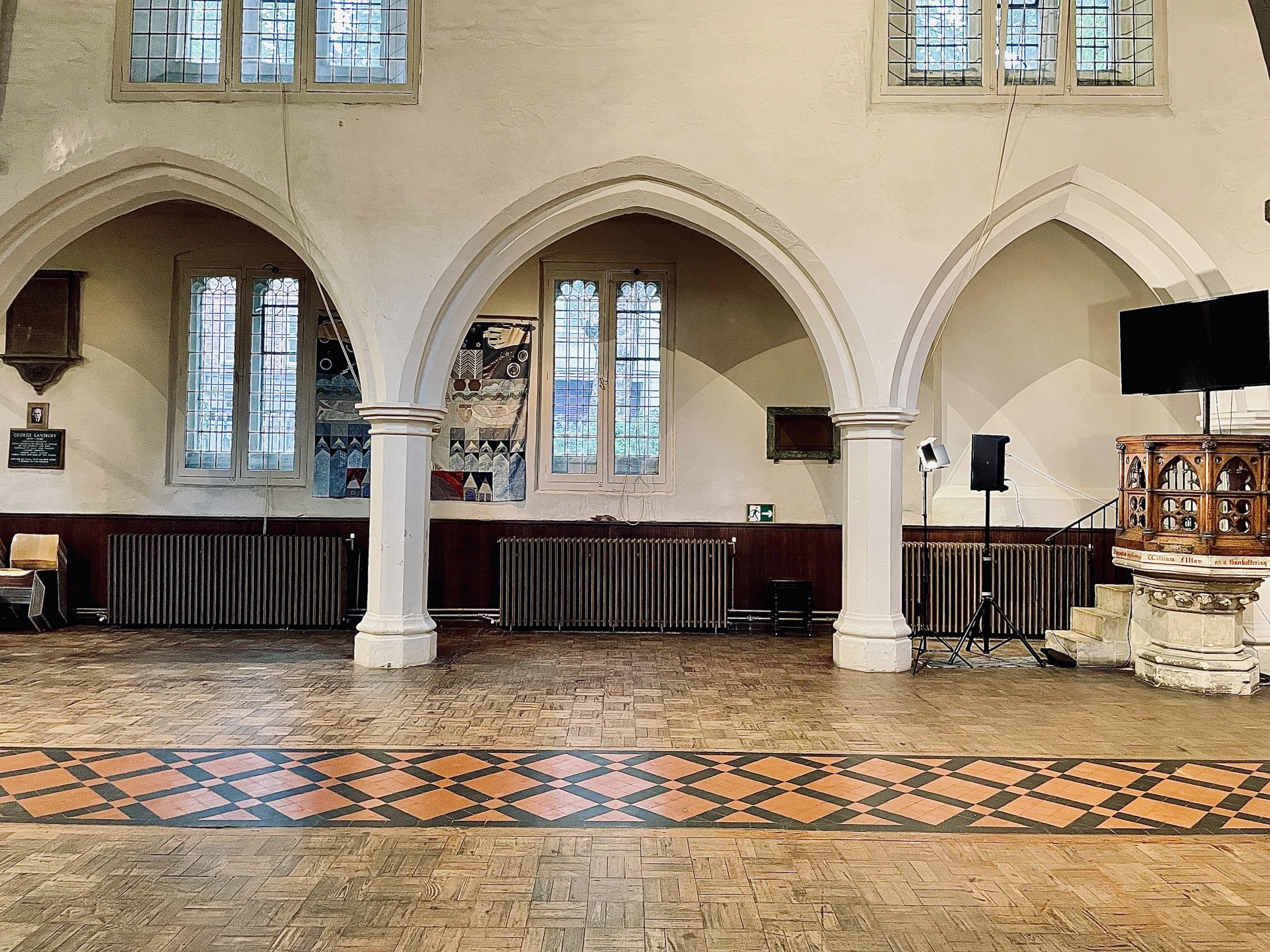 Our Grade II* Arts and Crafts Parish Room, designed by CR Ashbee, is suitable for smaller events as well as for small meetings and can accommodate around 8-12 people for board meeting around tables. The room is equipped with a kitchen area and wireless internet.